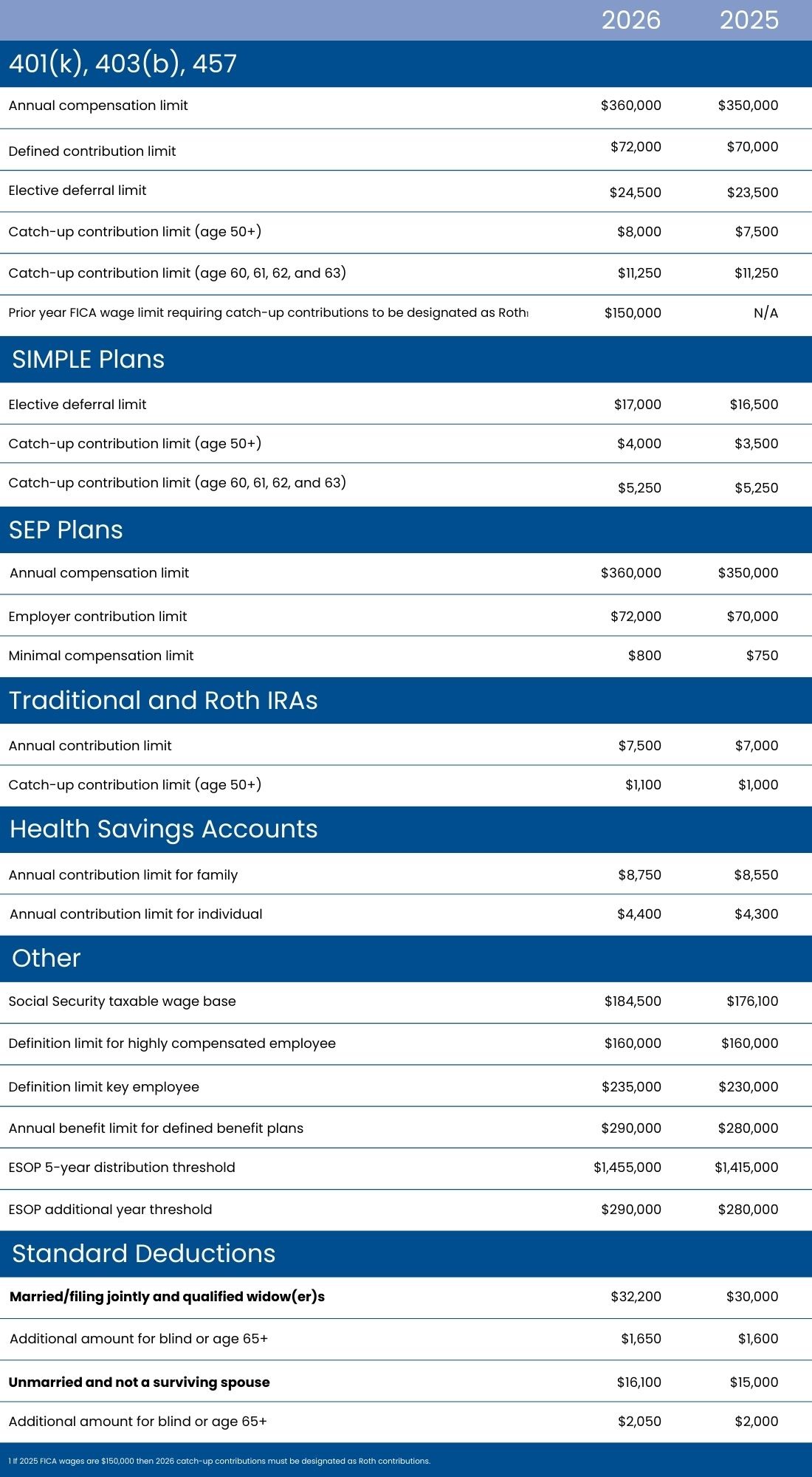 Business owners and employees using SIMPLE IRAs will also see higher contribution limits. These updates may create planning opportunities, especially for small business owners reviewing plan design or compensation strategies.